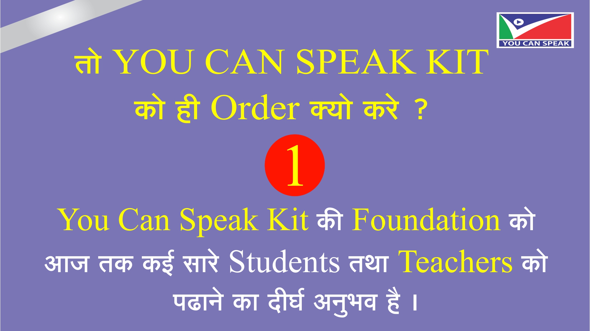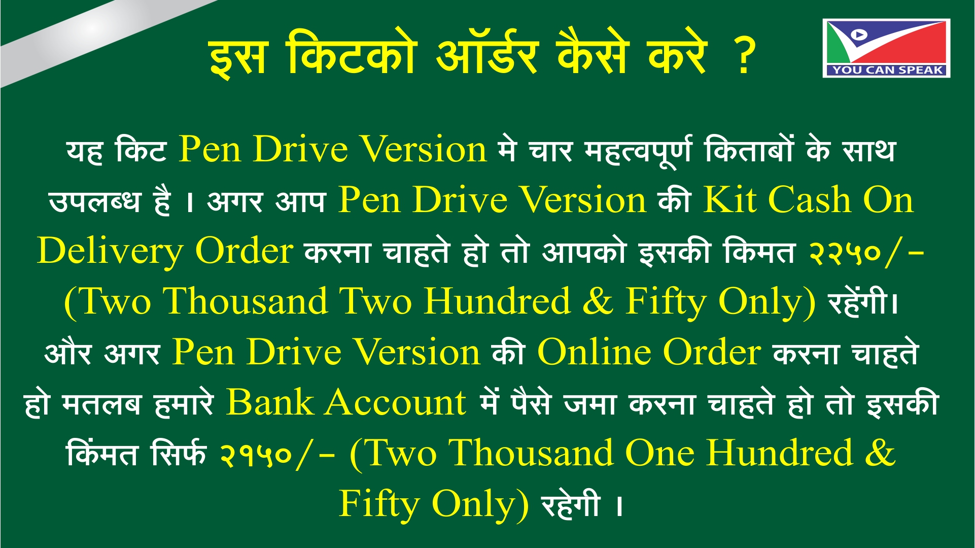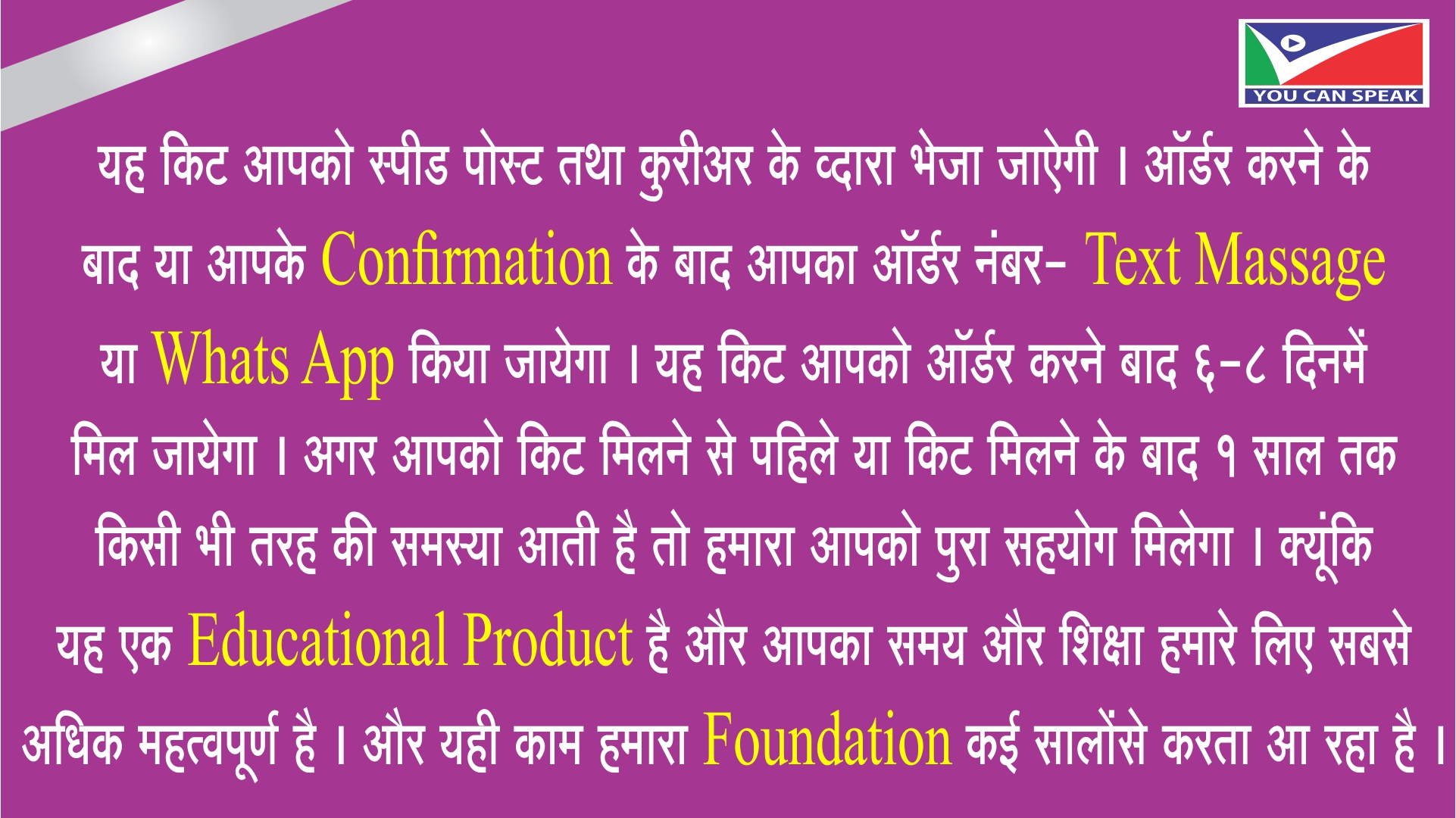 "आप अंग्रेजी बोल सकते हैं" एक बहुत ही उपयोगी किट है जो आपको स्वाभाविक और आसानी से अंग्रेजी बोलने के कौशल को बेहतर बनाने में मदद करती है। सुनो, दोहराओ और तुलना करो! यह अद्भुत, आसान, मज़ेदार और उसी तरह काम करता है जैसे आपने अपनी पहली भाषा सीखी। अपनी आगामी बातचीत के लिए बहुत सारे वाक्यों को जानें और उनका अभ्यास करें। आप किट सामग्री को 60 दिन से अधिक बोल सकते हैं। यह किट अंग्रेजी भाषा की 4 महत्वपूर्ण पुस्तकों के साथ अनुक्रम वार और दिन वार पेन ड्राइव शेड्यूल मे अब उपलब्ध हैं। यह अच्छी ध्वनि की गुणवत्ता और एनीमेशन के साथ प्रभावी वीडियो व्याख्यान प्रदान करता है। आप लिखित और संचार कौशल, व्याकरण, साक्षात्कार तकनीक और व्यक्तित्व विकास सत्रों के साथ बोली जाने वाली अंग्रेजी की उल्लेखनीय तकनीकों को बोल सकते हैं। समूह चर्चा और प्रभावी संचार के लिए किसी भी विषय पर किट आपको नॉनस्टॉप बोली जाने वाली अंग्रेजी तकनीक भी प्रदान करती है। आप बोल सकते हैं कि किट में बहुत सारी प्रभावी इंटरैक्टिव क्लासरूम तकनीकें हैं - गतिविधि आधारित शिक्षण और शिक्षण- अभिनव तरीके- सॉफ्ट स्किल्स- ऑल ग्रामर - लेखन और संचार कौशल के साथ। तो यह सभी के लिए एक अनोखी किट है। आप किसी भी वर्ग को शामिल किए बिना हमारे संरचनात्मक पैटर्न की मदद से अंग्रेजी भाषा के 2-4 लाख से अधिक वाक्यों का अभ्यास आसानी से कर सकते हैं और वाक्य निर्माण की ये प्रथाएं आपको घर पर या किसी भी कक्षा में शामिल हुए बिना अंग्रेजी के प्रवाह को प्राप्त करने में मदद करती हैं। इस प्रकार यह किट आपके समय और पैसे की बचत करता है। शिक्षक अपने स्कूलों में इन सभी तरीकों का उपयोग सर्वोत्तम परिणाम के लिए भी कर सकते हैं। आप २००५- २०१५ से महाराष्ट्र के स्कूलों में हमारे काम देख सकते हैं। कई स्कूलों ने अपने छात्रों को हमारी तकनीकों और तरीकों के साथ पढ़ाना शुरू कर दिया है। इसके अलावा, हमने इस अच्छी किट को प्रकाशित करते हुए अंग्रेजी भाषा के कई विशेषज्ञ शिक्षकों से मूल्यवान दिशानिर्देश लिए हैं। तो यह 100% गारंटी है - अनुभव आधारित - प्रभावी- अद्वितीय- के लिए उपयोगी सब। सर्वोत्तम परिणाम के लिए कृपया हमारे सभी वीडियो लेक्चर शेड्यूल को केवल हमारी 4 पुस्तकों के साथ देखें। शुभकामनाएं