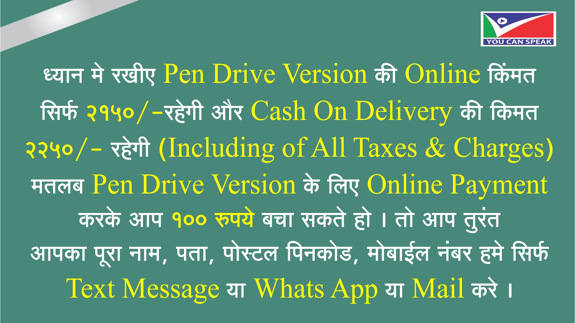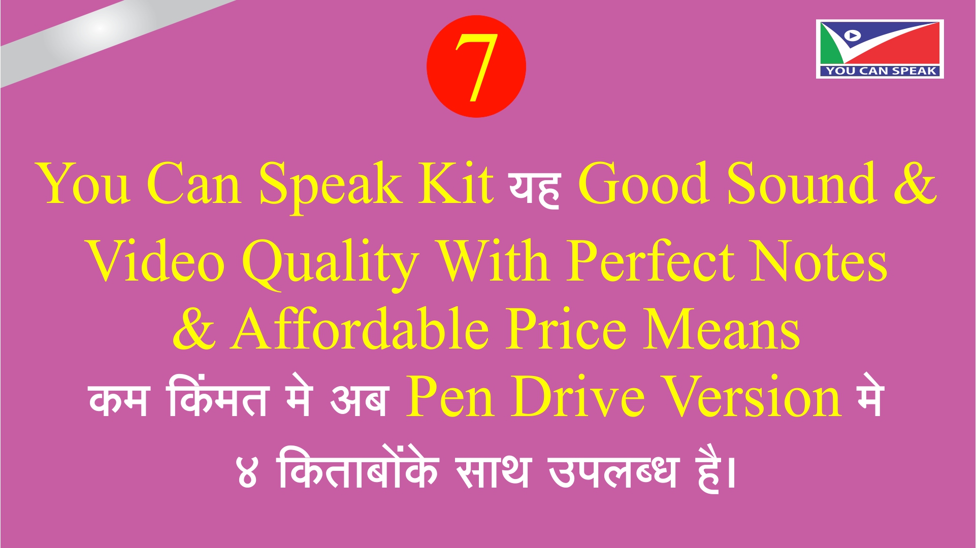 "You can speak English" is a very useful kit which helps you to improve English speaking skills naturally and easily. Listen, Repeat & Compare! It's amazing, easy, fun and works in the same way as you learned your first language. Learn and practice a lot of sentences for your upcoming conversations. You can speak kit contents more than 60 Days. sequence wise & day wise pen drive shedule along with 4 important books of English language. It provides effective video lectures with good sound quality & animation. You can speak contents remarkable techniques of spoken English with writing & communication skills, grammar, interview techniques & personality development sessions. The kit also provides you nonstop spoken English techniques on any topic for group discussion and effective communication. You can speak kit has so many effective interactive classroom techniques - Activity based teaching & learning- Innovative methods- Soft skills- All Grammar - With writing and communication skills. So it's a unique kit for all. You can easily do the practice more than 2-4 lakh sentences of English language with the help of our structural pattern without joining any class & these practices of sentence constructions help you to achieve the fluency of English at home or without joining any class. Thus the kit saves your time and money.Teachers can also use all these methods in the their schools for the best result. You can see our work in the schools of Maharashtra since 2005- 2015 . Many schools have started to teach with our techniques and methods on their students.Also we have taken valuable guidelines from many expert teachers of English language while publishing this nice kit.So it's a 100% Guaranteed - Experience based - Effective- Unique- Useful for all. For the best result please watch our all video lectures schedule along with only our 4 Books. All the best.